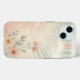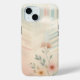 This mobile case features a delicate and feminine design with a pastel colour palette. The background showcases soft, vertical stripes in shades of pink, blue, and beige, while fluffy white clouds drift across the top. In the foreground, delicate pink and yellow flowers bloom on slender stems, surrounded by green leaves. The overall aesthetic is calming and serene.