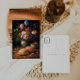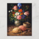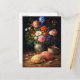 The bold contrast between the dark backdrop and the colorful florals creates a striking, fine art feel, while the soft textures of the bread and subtle steam from the coffee add warmth and everyday charm. Inspired by traditional still life painting, this design offers a refined and modern take on a timeless composition.