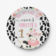 Cute cow themed birthday paper plate featuring and black spotted cow, pink floral arrangements and a cow print pattern background. This cow birthday party plate is ideal for a cow themed girl's birthday party. Faux gold glitter number image is removable.
