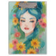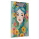 This vibrant and whimsical design features an abstract portrait of a woman with teal blue hair adorned with colourful flowers. Her serene expression is accentuated by closed eyes and red lips, giving her a dreamy appearance. Surrounding her are vibrant sunflowers, pink blossoms, and an array of green foliage, creating a lush, garden-like atmosphere. The piece has a soft, vector painterly style, giving it a modern yet romantic feel. The colour palette is dominated by teals, yellows, pinks, and greens, creating a harmonious and eye-catching composition. Personalise with initials.