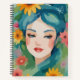 This vibrant and whimsical design features an abstract portrait of a woman with teal blue hair adorned with colourful flowers. Her serene expression is accentuated by closed eyes and red lips, giving her a dreamy appearance. Surrounding her are vibrant sunflowers, pink blossoms, and an array of green foliage, creating a lush, garden-like atmosphere. The piece has a soft, vector painterly style, giving it a modern yet romantic feel. The colour palette is dominated by teals, yellows, pinks, and greens, creating a harmonious and eye-catching composition. Personalise with initials.