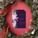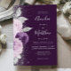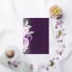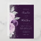 The left-hand edge of this elegant modern wedding invitation features a floral bouquet in shades of purple and lavender, trimmed with silver faux foil and faux glitter foliage and sprinkled with silver faux glitter. The customizable text combines real silver foil handwriting script, copperplate and italic fonts on a deep purple background. The reverse side features a matching floral design.