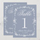 Classy and elegant botanical floral white and dusty blue wedding table numbers. As you see it features a blue old money background with white script that match the whole suite. And white outline floral frame.