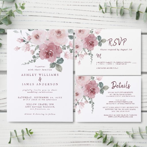 Floral Dusty Pink Rose Burgundy Wedding Invitation
