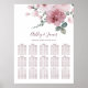 Floral dusty pink rose wedding seating chart with elegant handwritten script calligraphy and classic typography, and a stylish touch of watercolor painted roses in a lush pink and burgundy color palette on a white background. Exclusively designed for you by Happy Dolphin Studio.