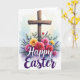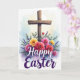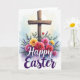 Designed with a soft watercolor look, the illustration centers on a sturdy wooden cross near the upper middle, shown with textured grain and carved-like edges. Around its base, a generous bouquet of spring flowers spills outward in deep fuchsia, warm coral, and sun-yellow, threaded with slender green leaves and a few lavender spires 🌷. The background fades into a calm wash of sky blues and gentle purples, like a quiet morning glow behind the focal scene. The arrangement leans in close to the cross the way close friends might gather, with petals overlapping and stems curving toward one another in a tender, companionable way. Near the lower portion, the greeting “Happy Easter” is placed prominently, with “Happy” in crisp white lettering above “Easter.” “Easter” appears in a rich, deep purple, standing out against the softer background tones. Fine paint transitions soften the edges of the flowers, and a small bunny silhouette in pale lavender sits tucked among the greenery 🐇.