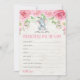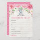 Cute & girly baby shower game featuring an adorable watercolor elephant surrounded with pretty pink flowers and green leaves
