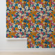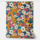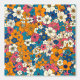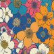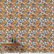 This artwork bursts with a dense and lively arrangement of vibrant flowers, creating a rich tapestry of colours and shapes. The floral motifs are rendered in bold shades of orange, blue, pink, and white, interwoven with delicate line work that adds detail and texture. The overlapping petals and varying sizes of the flowers give the design depth and energy, evoking a sense of abundance and celebration. The composition is both playful and intricate, with a dynamic balance of colour and form.