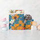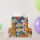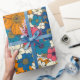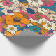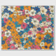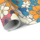 This artwork bursts with a dense and lively arrangement of vibrant flowers, creating a rich tapestry of colours and shapes. The floral motifs are rendered in bold shades of orange, blue, pink, and white, interwoven with delicate line work that adds detail and texture. The overlapping petals and varying sizes of the flowers give the design depth and energy, evoking a sense of abundance and celebration. The composition is both playful and intricate, with a dynamic balance of colour and form.