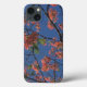 The original floral artwork on this Case-Mate iPhone 13 Case was created from an original photograph by ZoeSPEAK of a flowering tropical tree. The tree has thin black branches which form a linear pattern across the background. There are very few leaves on the tree, but there are plenty of tiny flowers in pompom clusters on all of the branches. The photo was taken looking up into the branches, with the sky as the background. In this version, the background is bright sky blue, and the flowers are shades of pink. The design has a canvas texture overall.