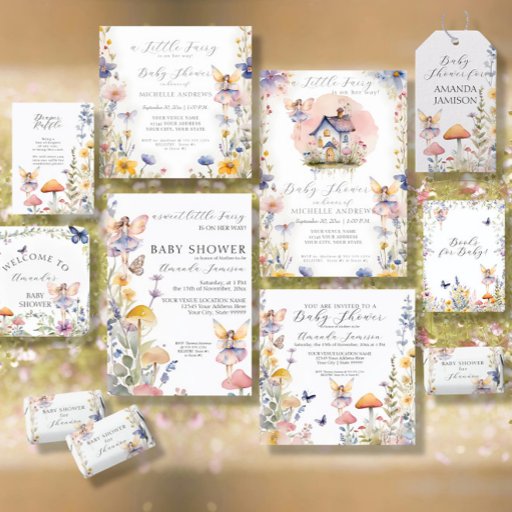 "A sweet little Fairy I on her way!" Celebrate her at a magical baby shower with this elegant, feminine, cottagecore enchanted fairy baby shower invitation that features colourful wildflowers, mushrooms and butterflies in a secret garden. There is a complete product collection available to coordinate: MSP0108