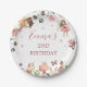 Sweet girl's fairy themed birthday party paper plate featuring three fairies, a gnome, mushroom and various flowers. The back of this invitation is a dark rose gold or plum colored glitter image. Ideal for a little girl having a fairy themed birthday party.