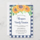 It is decorated with watercolor sunflowers and foliage in shades of yellow and green on a blue gingham background.