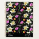 Fantasy flowers in white and magenta on a black background creates a beautiful planner that you will love. A black band at the bottom has space for you to personalise with your name and the year.