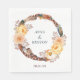 These pretty personalised wedding napkins feature a colourful boho pattern feather wreath that is embellished with pale gold and peach rose blossoms. Predominant colours are brown, orange, gold, peach, and teal. At the centre is your custom text in teal. Below the image is a second text field in cinnamon brown. Perfect for receptions, rehearsal dinners, showers, and more.