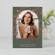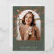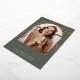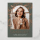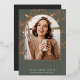 Elegant photo graduation announcement features a vertical or portrait orientated photo in a unique arched layout, on a dark sage green background with rose gold foil floral and botanical trim. "Graduate" appears beneath, along with your graduate's name and school or college. Add a personal message to the back, along with an additional photo.