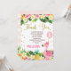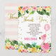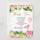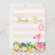 Sweet aloha or flamingo themed birthday thank you card featuring a mix colored floral arrangements with tropical flowers and foliage, a faux gold glitter calligraphy heading and a cute pink flamingo and balloon.