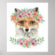 This design features watercolor portrait of a fox wearing a halo of flowers.