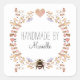 Earthy delicate stylised floral frame product product label stickers featuring "handmade by", with the maker's name within a pretty earthy stylised floral with pink heart and bee.