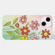 A vibrant phone case featuring a whimsical, hand-drawn style floral design. The background has a soft gradient that transitions from a light pink at the top to a pale green at the bottom. Several stylised flowers with smiling faces in shades of pink, red, and yellow are scattered across the case, some with long green stems and leaves. The overall aesthetic is cheerful, artistic, and colourful.