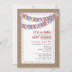 A baby shower invitation featuring red gingham, pink floral, and blue bunting on front at top over a lace inspired design. Background on front and back is burlap inspired. Personalise the text on front with details of your occasion.
