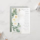 Elegant and classy white rose and eucalyptus floral prayer card design with dark gold-toned confetti and shadowing and a sepia gold-toned simple cross. Back features a watercolor gradient sage green background with green and sparse dark gold-toned confetti splatters.