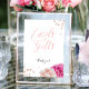 Bridal shower tabletop sign with the script "Cards and Gifts" with blush pink glitter and pink watercolor floral design. Choose a stylish picture frame for it and display in on the drink table.