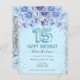 Girly glitter with fancy script name typography. Faux light blue 15 balloon text. Blue Roses and faux glitter top border. Great for quince celebrations.