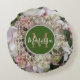 A gold decorative hexagon gold mandala on a backdrop of colourful bouquet of white, yellow, pink flowers. In the centre can be personalised on a green sphere with name, phrase, letter or logo.