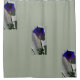 The floral images on the grey shower curtain are identical and features the pink-purple Morning Glory wildflower peeking through a wood fence and casting a shadow.