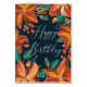 "Happy birthday" card with red yellow navy floral for friends.