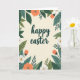 This card features a creamy beige background with “happy easter” written in dark emerald lettering centered on the front, with a gentle, welcoming look 🌷. Around the edges, a leafy border forms a cozy frame, like a garden wrapping its arms around the message. Deep teal leaves with fine vein lines mix with lighter olive branches, creating layered greenery that feels calm and close. Bright orange flowers with darker centers appear in small clusters, adding a friendly spark among the greens. White, daisy-like blooms with sunny yellow centers sit near the corners, as if leaning in toward the words like companions. Tiny coral-orange buds tuck between stems, giving the border a soft, affectionate rhythm 🐇. The text stays clear in the open center while the plants and flowers gather along the perimeter in an even, balanced ring. A faint, paper-like texture sits over the flat colors, and the border shows teal leaves, olive sprigs, orange blossoms, white daisies, and coral buds encircling the emerald greeting.