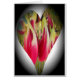 This artwork presents a heart-shaped composition intricately formed by stylised floral elements. The dominant colours include vibrant shades of red and pink, beautifully contrasted against a dark, almost black background that features a subtle gradient fading towards white within the heart itself.
