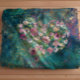 Romantic heart shape, floral, pink and white arrangement with gold, antique handwriting overlay over an abstract, bluish green, and gold paint wash.