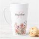 Floral Latte Mug. This beautiful design features dusty pink roses and dahlias, cream hydrangeas, and green and burgundy eucalyptus leaves. Personalise with the name and initial for a unique and stylish gift or a lovely keepsake for yourself.