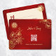 Gold line art flowers and a gold double happiness symbol on a shimmering red background. RSVP Chinese Wedding Card. At the backside is a scannable qr code for your wedding website.