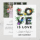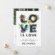 Pride elopement announcement personalised with a photo on the back. Gay floral wedding announcement with love is love printed with charming rainbow coloured flowers, custom text, and your wedding photo. LGBT love is love elopement announcement printed with your wedding photo and charming rainbow coloured flowers. Floral love is love marriage announcement with dark text and flowers in all the colours of the rainbow. Add your elopement information and a personal text along with a wedding photo from your elopement.