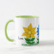 Pretty floral garden with golden yellow flower, blue yellow flower and purple tulip in the green grass. Love is written in black script around white mug with combo light green trim. Pretty mug to brighten up someone's day. Original Artwork by TamiraZDesigns.