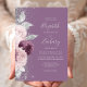 The left-hand edge of this elegant modern wedding invitation features a floral bouquet in shades of mauve and blush pink, trimmed with silver faux foil and faux glitter foliage and sprinkled with silver faux glitter. The customisable text combines pale silver grey handwriting script, copperplate and italic fonts on a mauve background. The reverse side features a matching mauve and silver floral design.