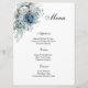 Menu card is shown with a lovely dusty blue floral print, shown on the white signature matte card paper.