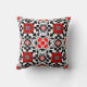 Throw pillow in an Art Deco Moroccan tile pattern based on stylised flowers and leaves - deep Chinese red with classic black and white, accented with silver grey / grey