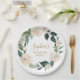 Pretty watercolor floral mother's blessing party plates feature the name of the mother-to-be in elegant gold colour calligraphy script, and a beautiful floral and greenery wreath border. This lovely paper plate is part of the Christian mother and baby blessing party collection, and is also editable for a variety of occasions and celebrations.