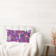 This lumbar throw pillow is decorated with trippy, psychedelic illustrated mushrooms and flowers in shades of hot pink and bold purple against a black background.
