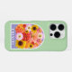 This personalized floral cell phone cover features soft, calming sage green as the background, creating a peaceful and natural look. At the center is a charming arched window design in gentle lavender tones, showcasing real flowers grown in my garden and photographed by Meggidoo.