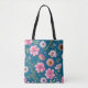 A beautiful floral pattern against a peacock blue background on a reusable tote bag.