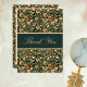 This flat thank you card features a William Morris inspired floral print of dark green, sage, peach, and cream, along with the text "Thank You" on the front. On the back, there's a thin floral border and an area where you can type text, if you want each card to have the same message -- for an example, if this is for a club, employees, or sales. If you want the area blank, make sure to delete the placeholder text.