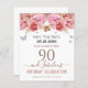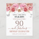 Girly glitter, millennial pink background, with fancy script name typography. Happy 90 and fabulous birthday design template. Pink Roses and butterfly top border. Great for 90th celebrations. Save the date celebration reminder.