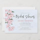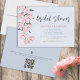 This design features a floral botanical elegant pink flower, a bridal shower with pretty cherry blossoms, a QR code website online URL, a gift registry store website link, a stylish trendy calligraphy script, a summer bright pink garden flowers, light blue-green foliage, modern elegant typography style, a watercolor hand-drawn illustrations, a pretty garden pink floral pattern