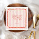 Red line art flower botanical illustration with red text and hand drawn dotted border over light pink stripe background.