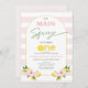 Sweet lemon themed first birthday invitation for a baby girl featuring some pink floral and lemon arrangements, pink striped pattern and a modern calligraphy heading on a white arch. This main squeeze 1st birthday invitation also features a decorative word with a lemon slice which spells one.